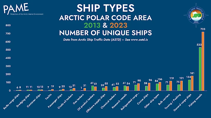 © Adobe Stock Arctic Shipping Update: 37% Increase in Ships in the Arctic Over 10 Years January 31, 2024OceanProtection of the Arctic Marine Environment The Arctic Council Working Group on the Protection of the Arctic Marine Environment (PAME) published an update of 10-year trends in Arctic shipping, utilizing its Arctic Ship Traffic Data (ASTD) System. Arctic shipping continues to increase, according to an update of PAME’s Arctic Shipping Status Report #1: The Increase in Arctic Shipping. The original report covered the period 2013-2019. The updated report adds data for 2020-2023. Increase in ships in the Arctic and distance sailed The number of unique ships entering the Arctic Polar Code area[1] from 2013 to 2023 increased by 37%, around 500 ships. Unique ships refers to each ship only counted once, although it might enter the area multiple times over each year.